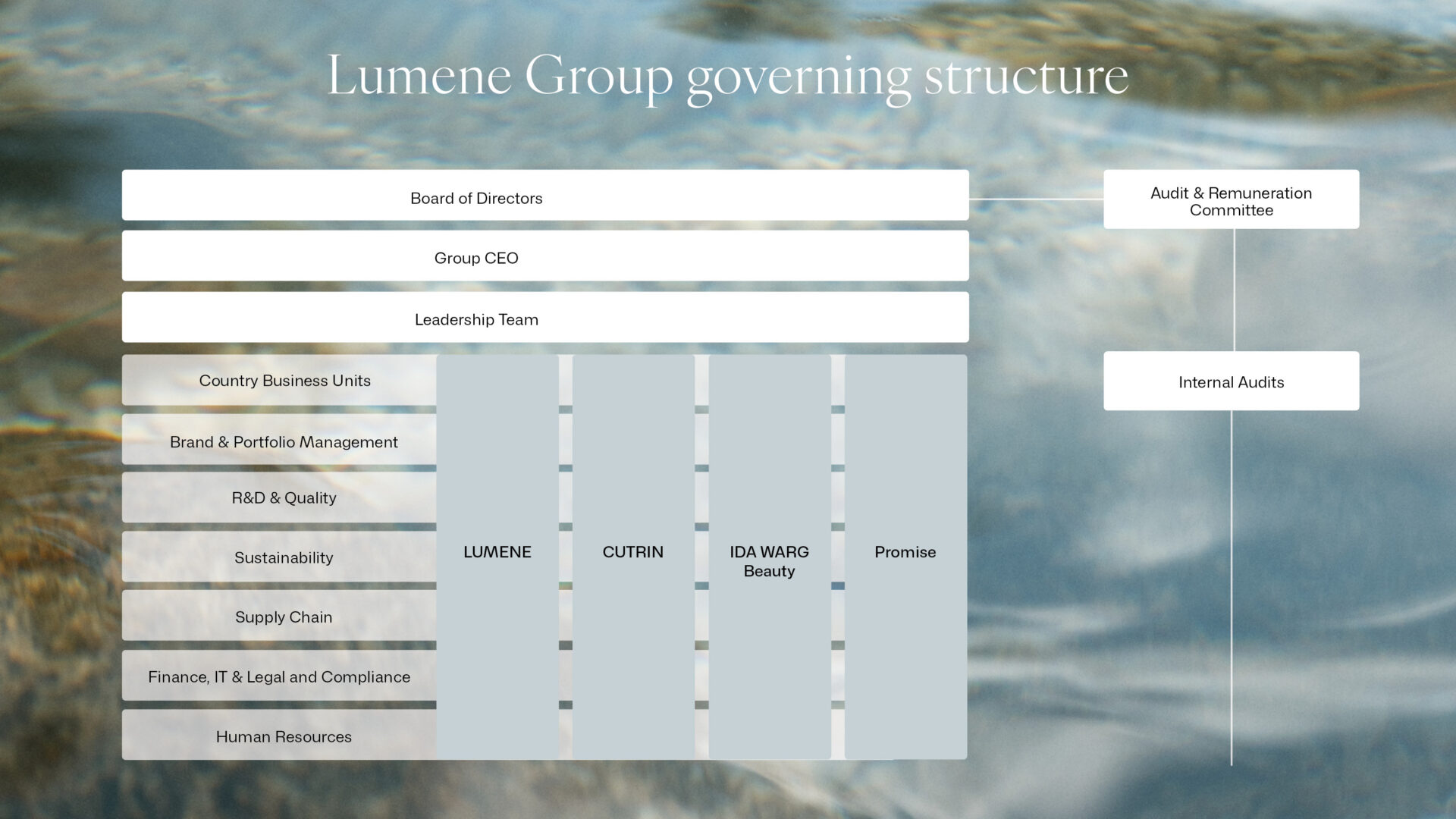 The Lumene Leadership Team (LLT) is responsible for the management of business operations and the efficient implementation of the strategies in accordance with the objectives set by the Company’s Board of Directors and the Group CEO. Their goal is to maximise the Group’s performance including the achievement of business targets. The LLT meets regularly, at least once a month.